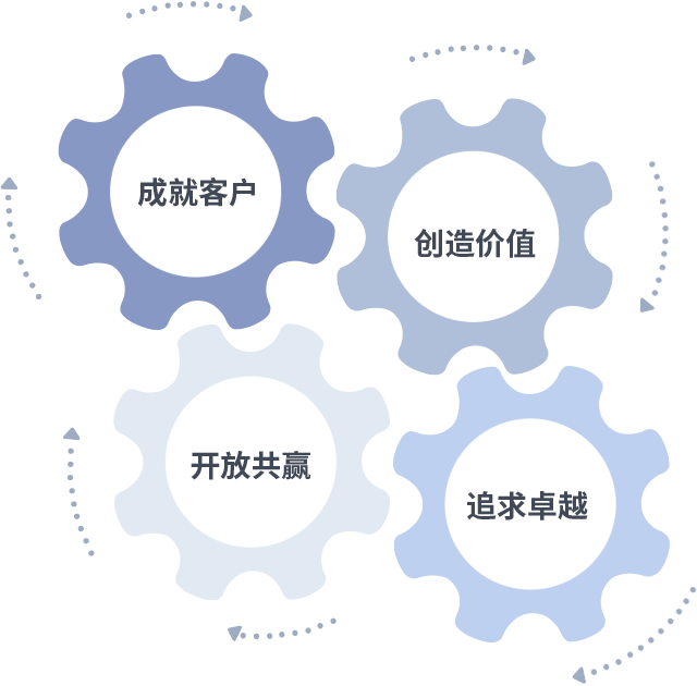 成就客户是一切决策的出发点,创造价值是衡量所有工作的标准,追求卓越是巅峰国际做事做人的态度,开放共赢是巅峰国际的格局也是最终的结果。价值观的齿轮环环相扣,推动着组织里的每个人不断向前。